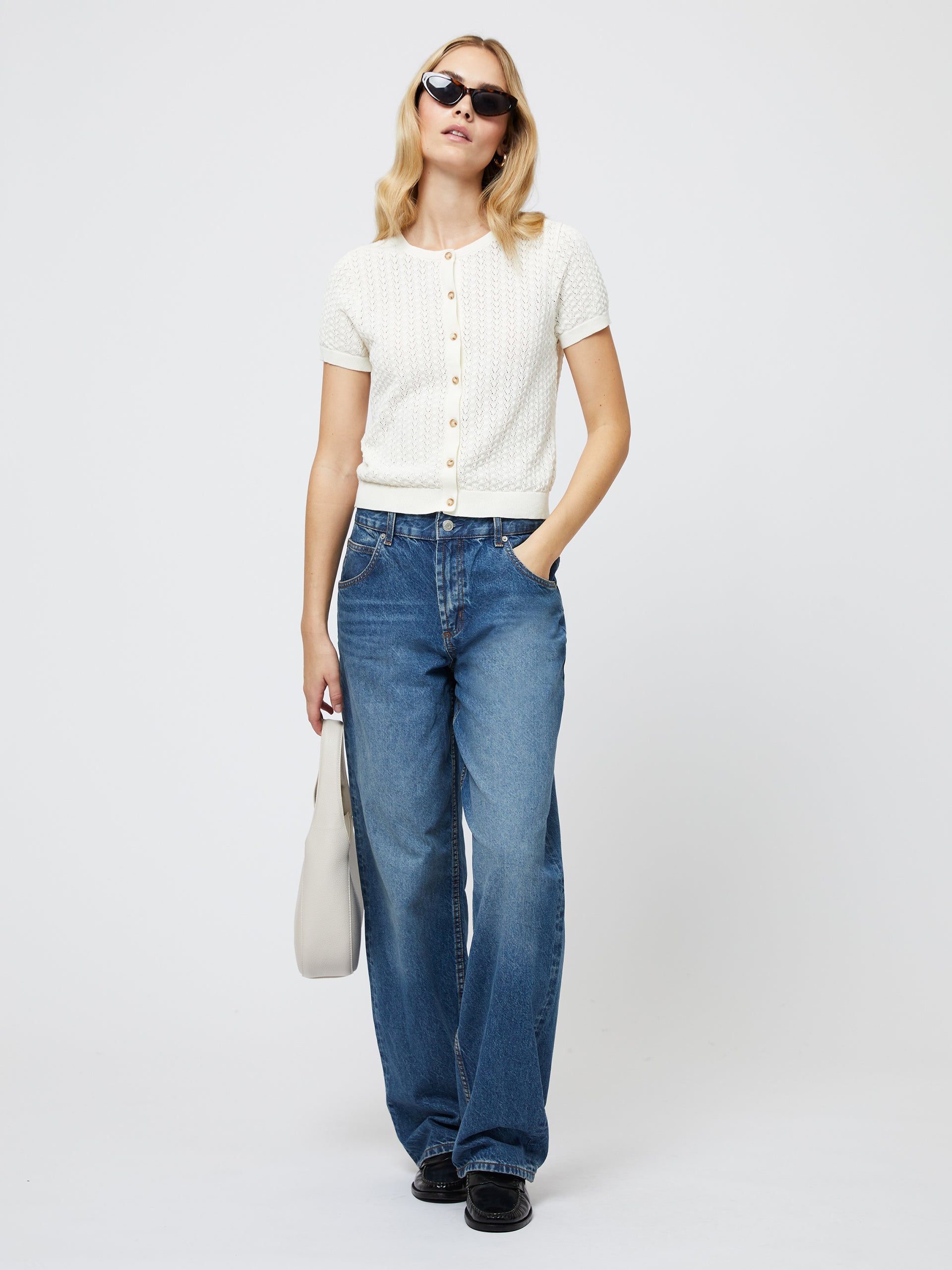 Introducing our COTTEN BLEND POINTELLE CARDIGAN, the perfect addition to your spring wardrobe. This short sleeve cardigan fits like your favorite baby tee, and features all over pointelle for a delicate look. Made with a cotton blend, it's lightweight and comfortable for all-day wear. Elevate any outfit with this elegant piece.