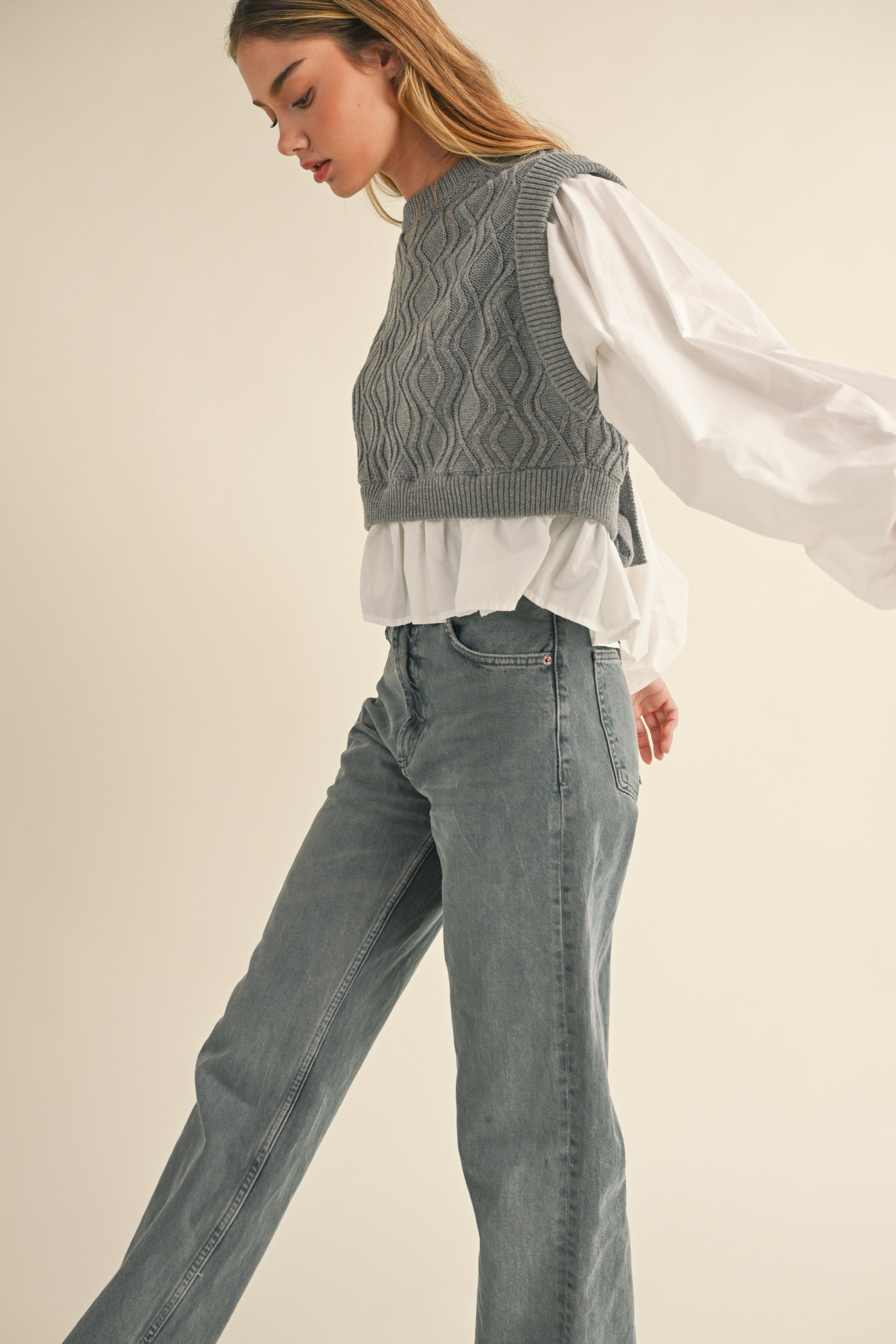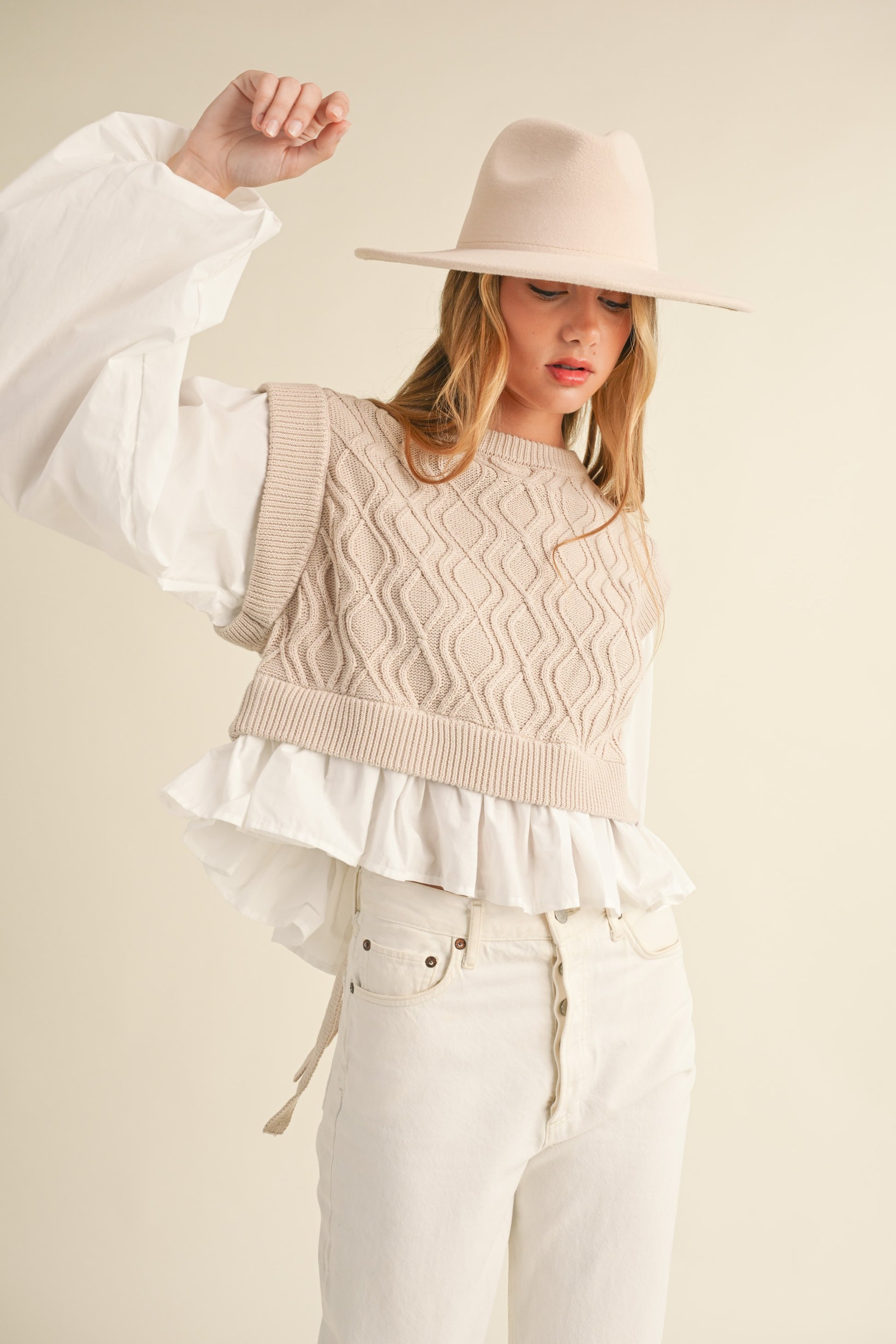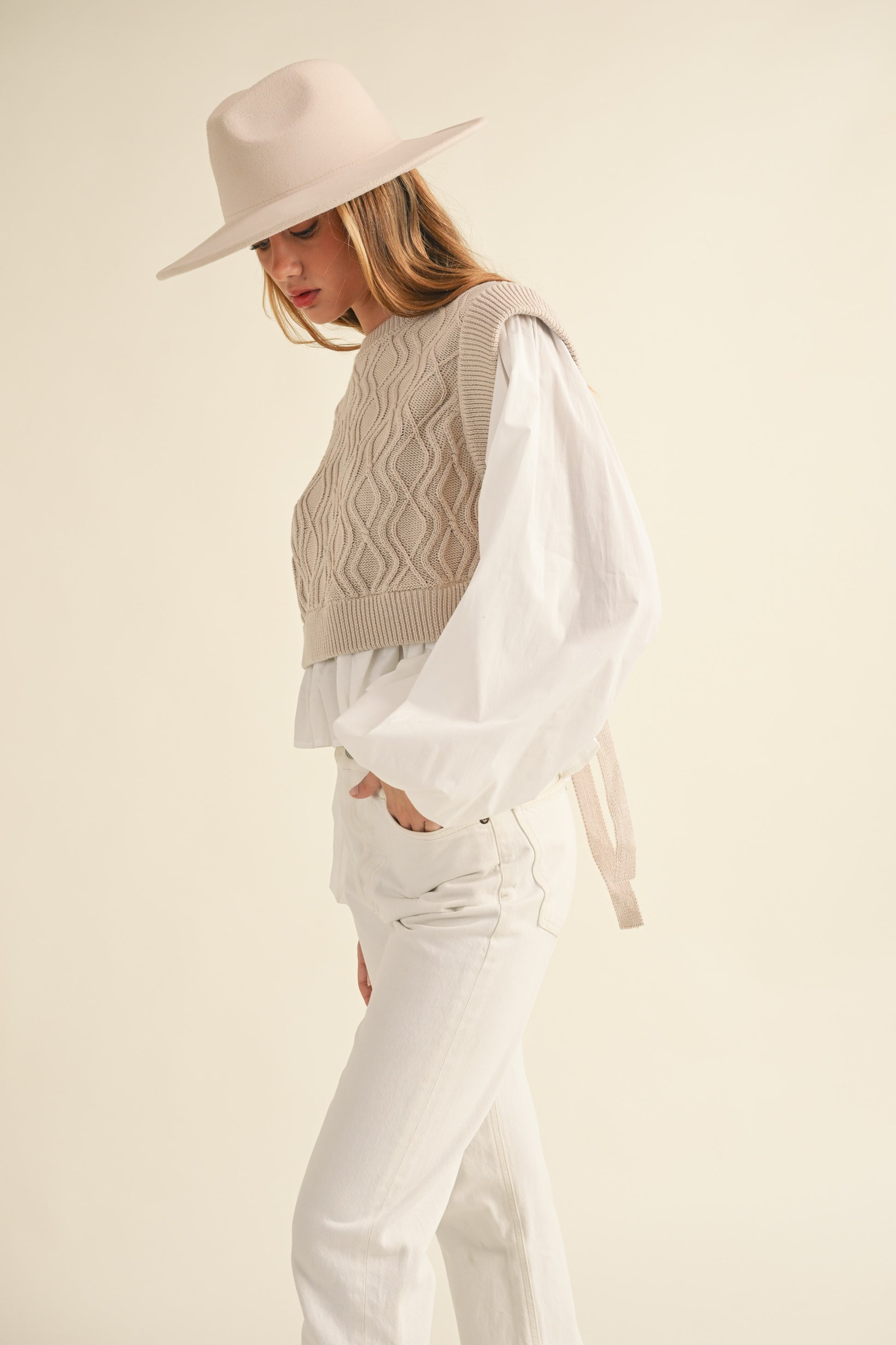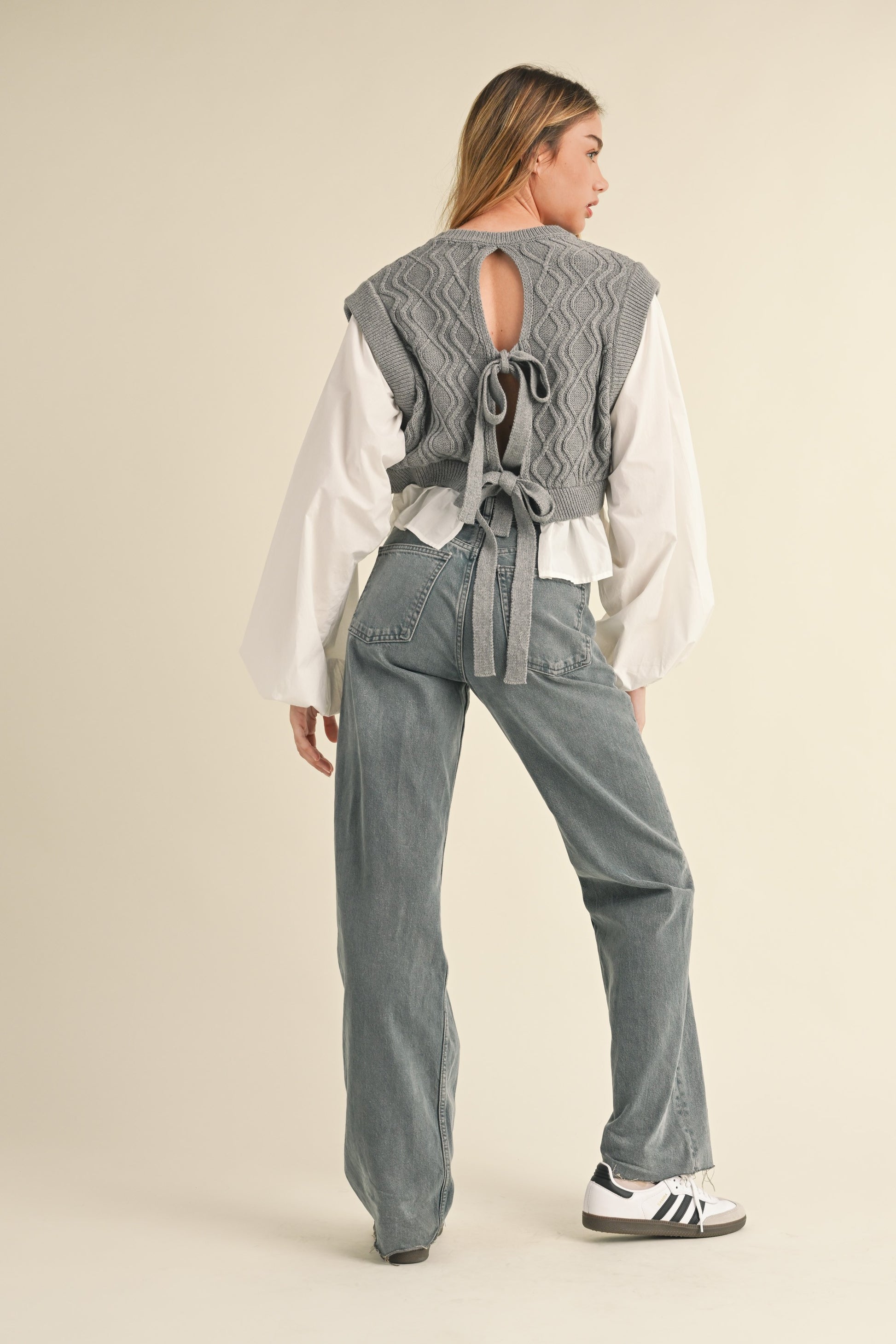 The HEIDI TOP combines cozy cable knit and elegant poplin for a unique mix of style and comfort. The balloon sleeves add a touch of flair, while the open back and self tie detail offer a customizable fit. Perfect for staying chic and cozy this season.