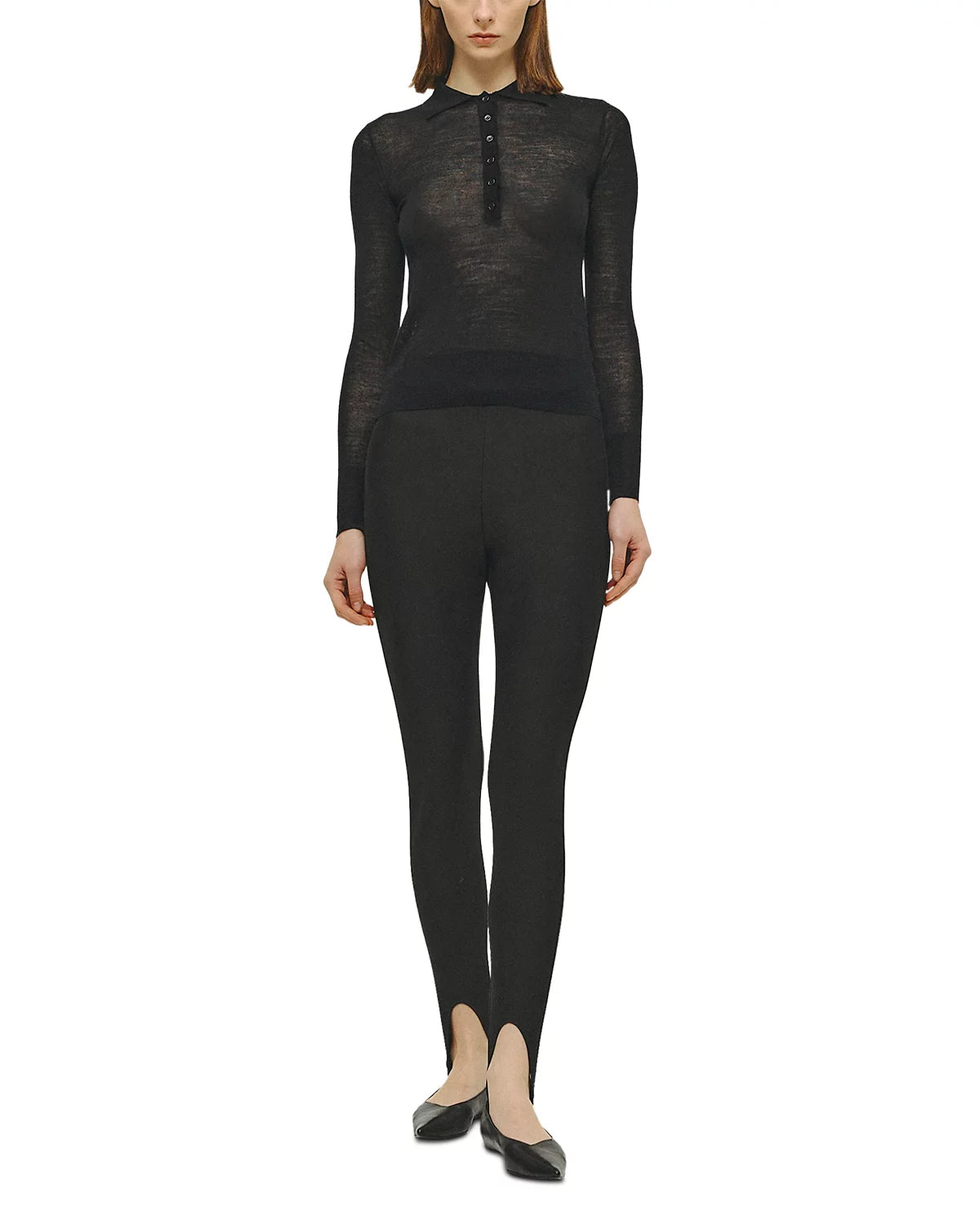 The Henni Polo Sweater features a classic polo collar, long sleeves, and a pullover design with partial front buttons. Made from sheer, unlined 100% wool, it offers lightweight warmth and a delicate texture. Dry clean only to maintain its quality.