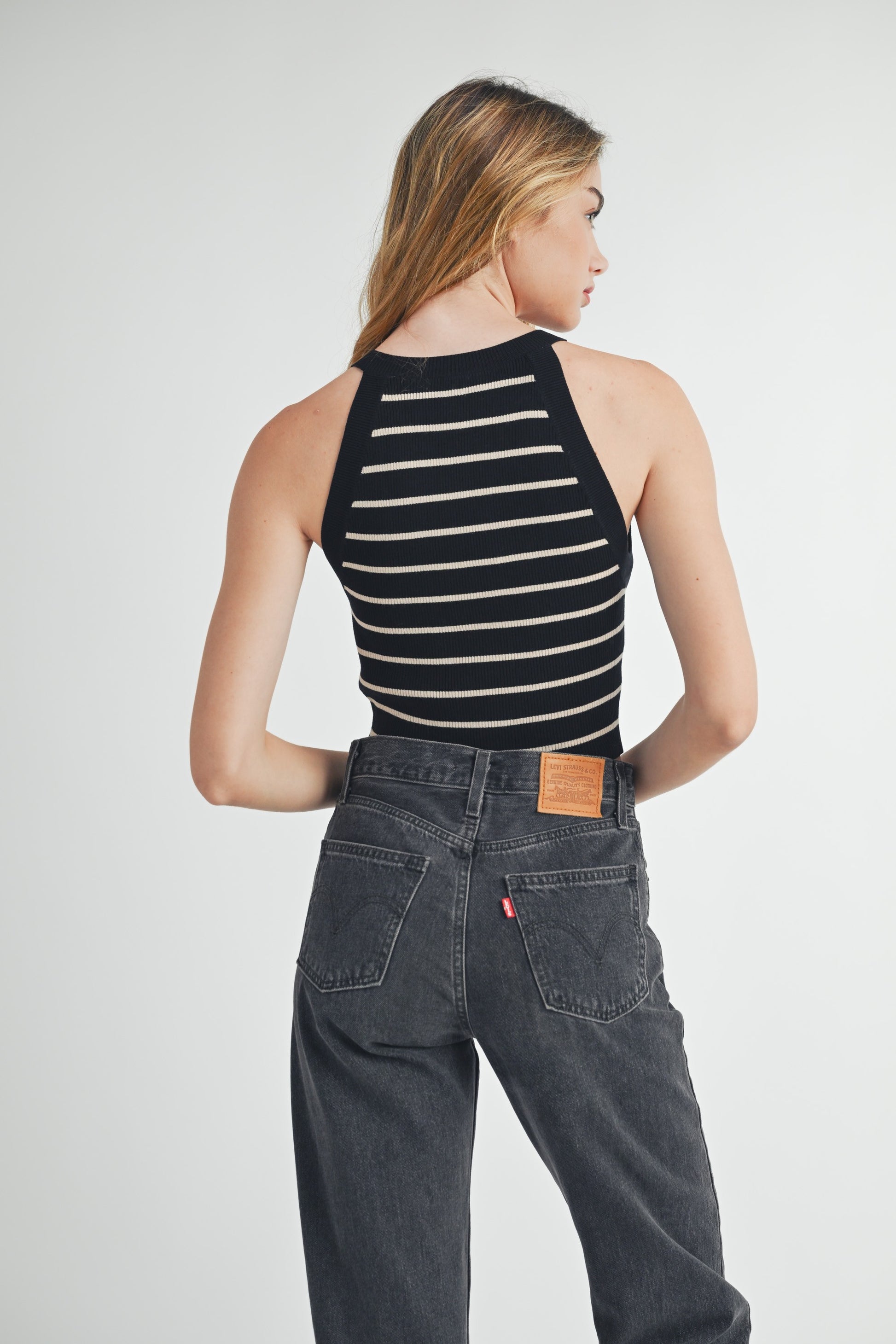 The JENNIFER TOP is a versatile addition to any wardrobe. With its sleeveless design and halter neckline, this top offers a stylish and comfortable fit. Crafted from soft viscose knit material, it features trendy stripes and a cropped cut. Elevate your look with this chic and flattering piece.