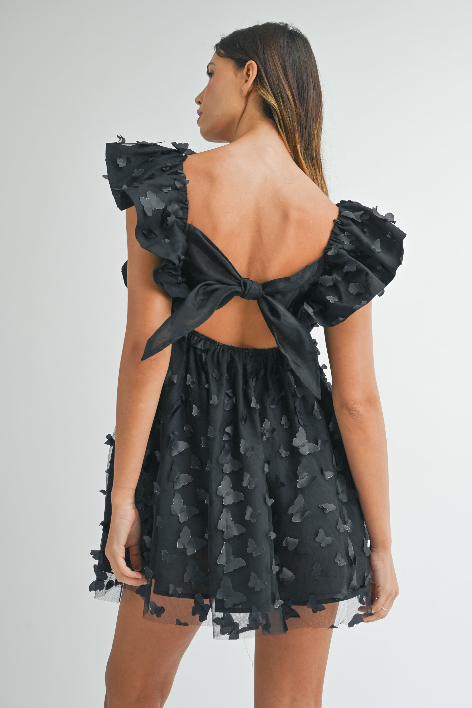 A stylish and chic addition to your wardrobe. This dress features a unique butterfly textured mesh print, ruffle sleeve and pleated bust detail, and a deep v-neckline. The open back with self tie detail adds a touch of femininity, while the lining ensures comfortable wear. Perfect for any occasion, this micro mini dress is a must-have.