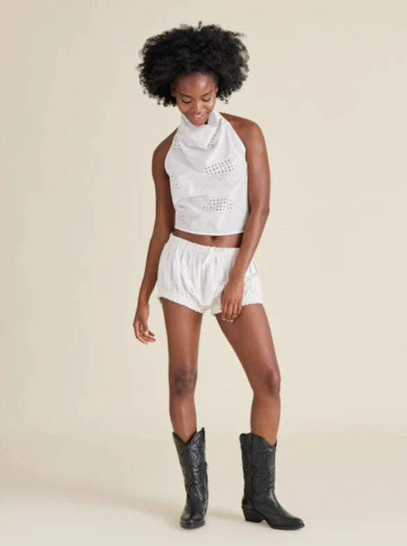 Envelop yourself in the airy elegance of the Steve Madden Lou Top, crafted from a breathable fabric adorned with intricate eyelet embroidery that whispers tales of sun-drenched days. Its gracefully draped cowl halter neck and effortlessly cropped silhouette capture that golden hour glow, designed for moments of spontaneous creativity and gentle self-expression. This versatile piece, blending artisan charm with urban ease, becomes a cherished part of your narrative as you collect memories, not just trends.