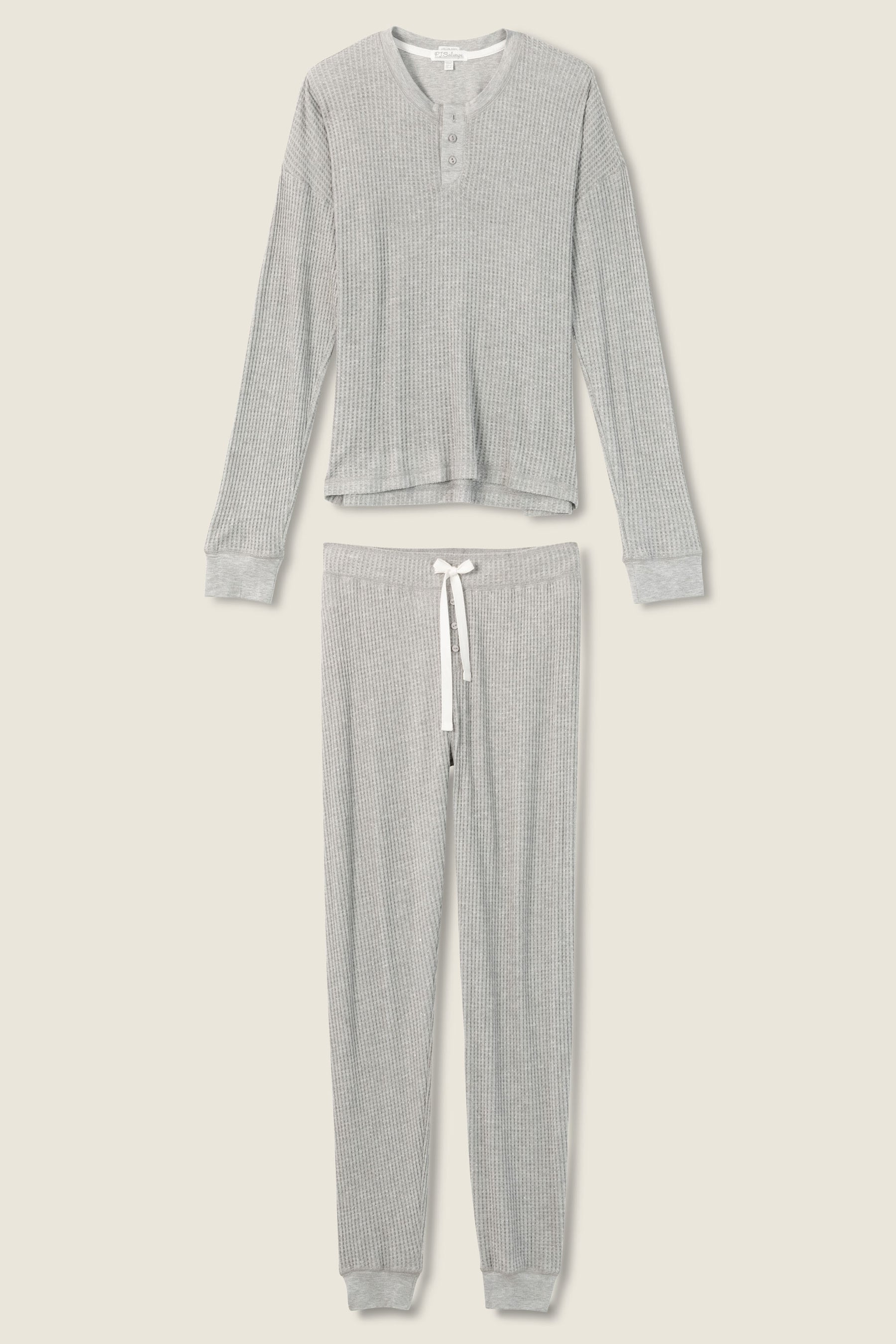 Shine bright this holiday season with our ski jammie classic set featuring a henley top and banded pajama pants. The set features a lovely white star embroidered on the sleeve and ankle cuffs. Perfect for chilly winter nights, these ski jammies offer a delightful blend of style and comfort. Cozy up in these festive pajamas, and let the spirit of peace and joy fill your home as you enjoy the magic of the season!
