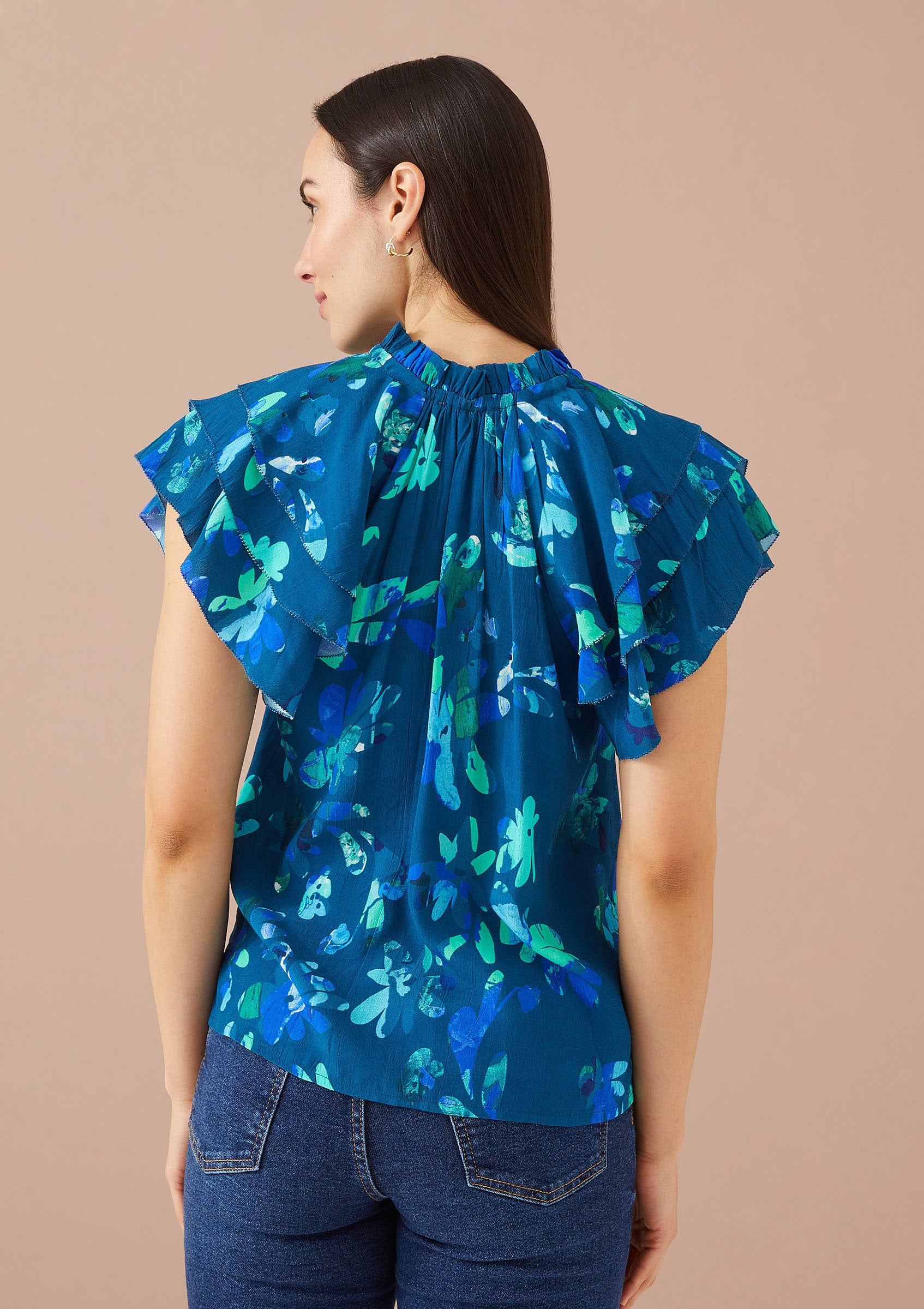 Flutter sleeve v-neck top that pairs great with denim or tucked into a skirt. Ruffle trim neck trim detail and optional adjustable neck tie. We recommend pairing with our Olivia Skirt for a full look!]